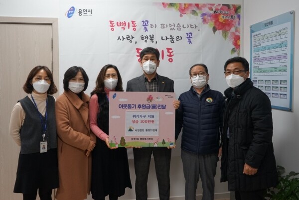 동백1동에선 사단법인 환경21연대가 동 행정복지센터를 찾아 이웃 돕기에 써달라며 성금 100만원을 전했다.