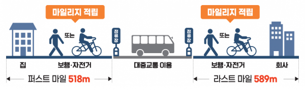 특히 출발지에서 대중교통 승차지점까지는 518m, 대중교통 하차지점에서 도착지까지는 589m를 이동한 것으로 분석됐다.