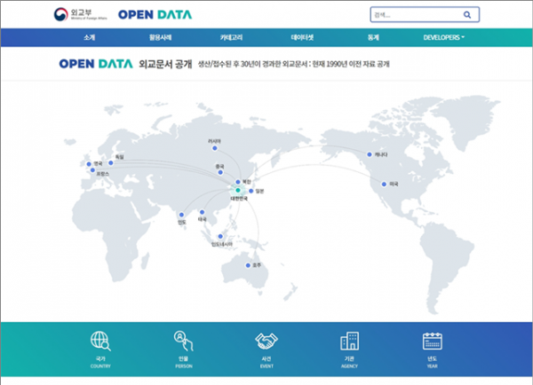 이는 외교문서 개방형 연결 데이터 적용의 첫 사례로 공공데이터 뉴딜사업을 통해 추진됐으며 앞으로도 외교부가 보유한 공공데이터를 다양한 형태로 확대 개방해 나갈 예정이다.