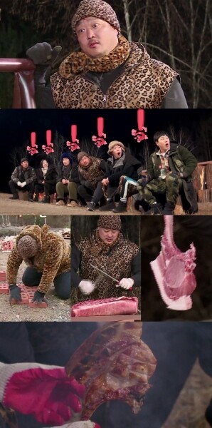 이후 뻐꾸기 소리와 함께 2차로 전쟁 같은 퀴즈시간이 펼쳐졌는데 그에 앞서 멤버들의 눈을 휘둥그레지게 만든 고기덩어리가 등장해 모두의 시선을 강탈했다.