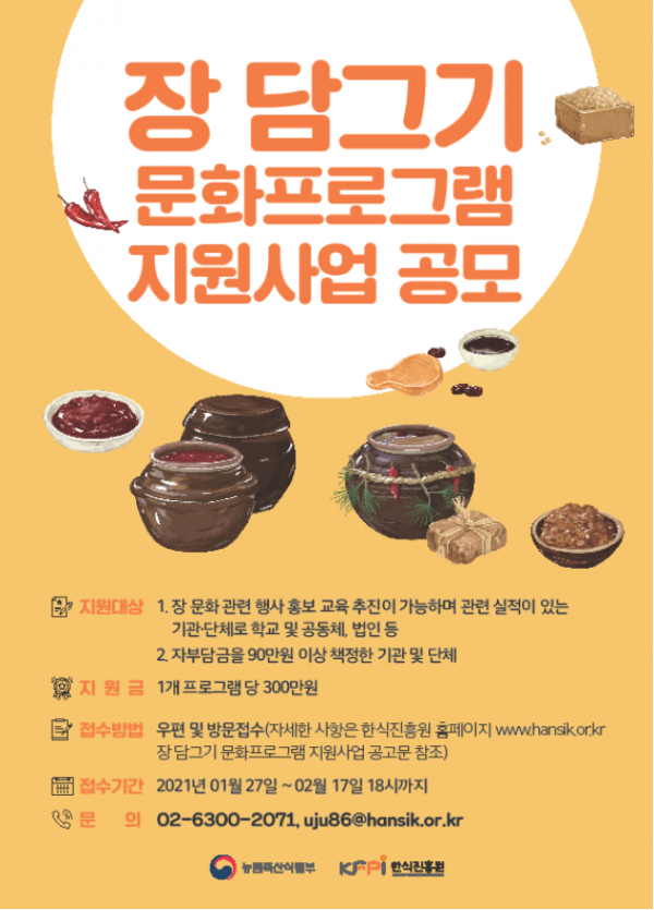 이번 공모는 2022년 유네스코 인류무형문화유산 등재신청 대상으로 선정된 ‘한국의 전통 장 문화’를 보급하고 국민적 공감대를 형성해 유네스코 등재 기반을 조성하기 위해 진행된다.