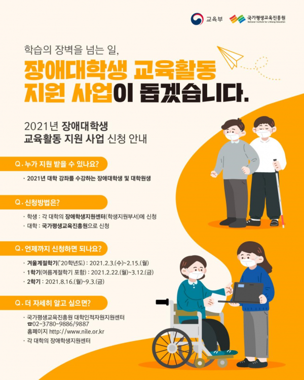 2005년부터 추진하고 있는 ‘장애대학생 교육활동 지원 사업’은 교육지원인력 등을 통해 장애대학생에게 대학 내 학습지원 및 학습활동을 위한 이동·편의를 지원하고 수어통역, 속기 등을 통해 학습을 지원한다.