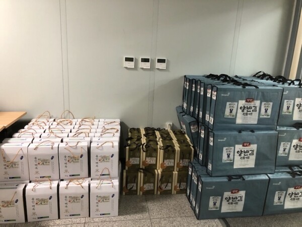 각 꾸러미에는 4㎏짜리 백옥쌀, 잡곡, 김이 담겨있다.