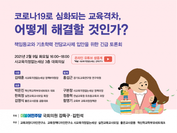 이번 토론회는 김민석 국회의원과 공동으로 주최하고 교육과정디자인연구소·사교육걱정없는세상·실천교육교사모임·좋은교사운동·혁신학교학부모네트워크 이상 5개 교육연대체와 함께 공동으로 주최한다.