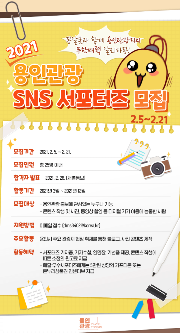 시 관계자는 “용인시 관광 분야에 애정과 관심을 갖고 우수 관광 정보를 생생하게 전달할 수 있는 분들이 많이 참여해주기 바란다”고 말했다.