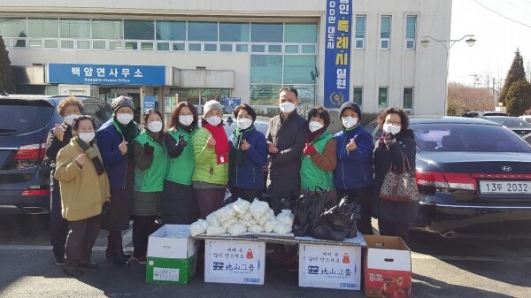 이날 부녀회 회원들은 대상 가정을 방문해 고기 500g~1kg, 떡국떡 1봉지, 마스크 30장씩을 전달하고 안부를 살폈다.