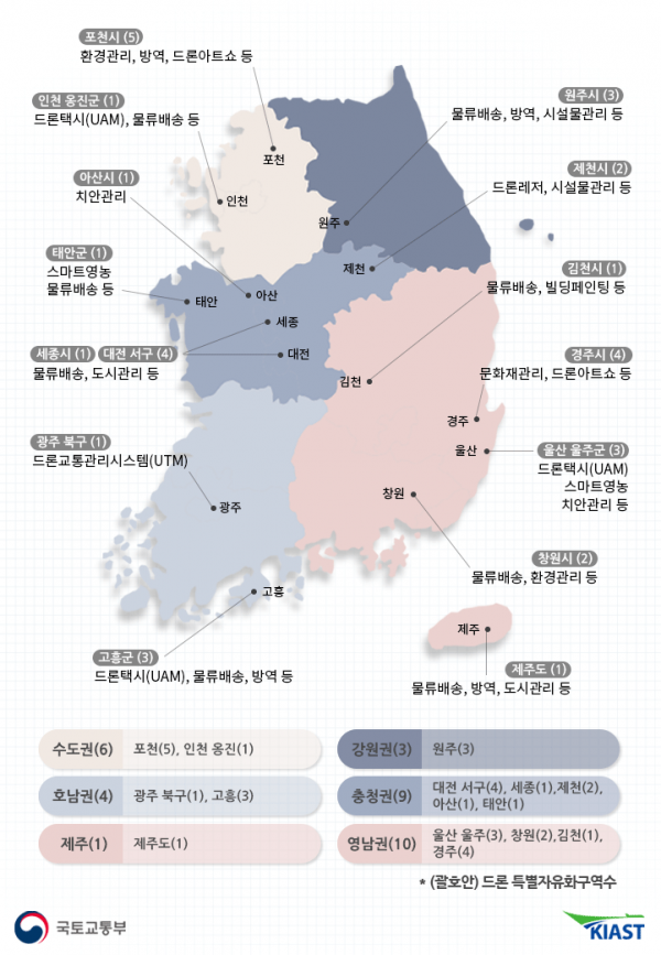 지난해 7월 최초로 시행한 ‘드론 특별자유화구역’의 공모에는 총 33개 지자체에서 참여했으며 국방부·군부대와의 공역협의와 현지실사, 민간전문가 평가, 드론산업실무협의체 심의 등 7개월간의 절차를 거쳐 최종 15개 지자체의 33개 구역이 선정됐다.