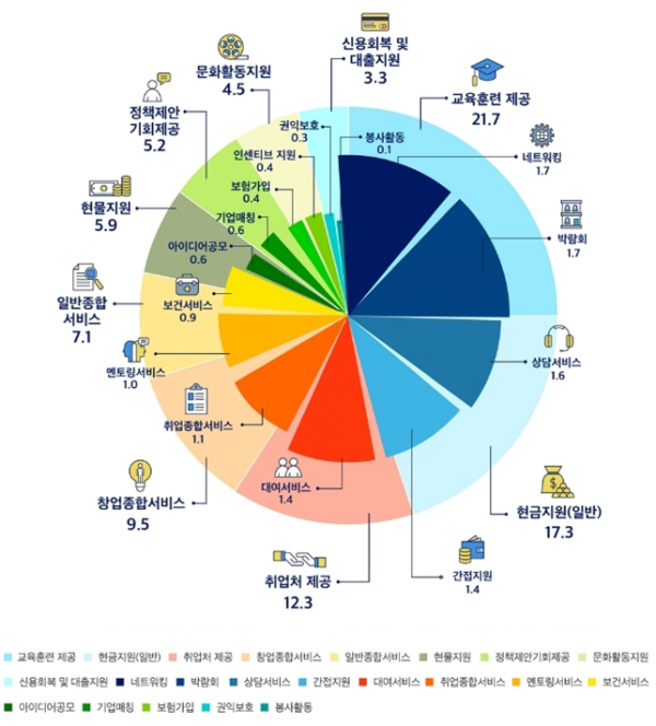 청년정책 정보를 기준으로 서비스 성격을 유형화한 결과, 교육훈련 제공 정책 636개 현금지원 507개 취업처 제공 359개 창업 종합서비스 278개 일반 종합서비스 208개 현물지원 174개 등의 순이었다.