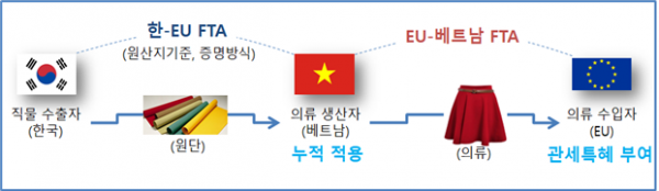 EVFTA 누적규정에 따라 베트남에서 생산해서 EU로 수출되는 의류에 결합되거나 추가 가공된 한국산 직물을 베트남산으로 간주해 FTA 관세혜택이 주어진다.