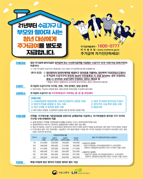 청년 주거급여 분리지급은 주거급여 수급가구 내, 20대 미혼자녀가 학업이나 구직 등을 목적으로 부모와 따로 거주하는 경우, 부모에게 지급되는 주거급여와는 별도로 자녀에게 주거급여를 지급하는 제도로 올해 1월부터 시행하고 있다.