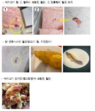 돼지고기 또는 닭고기 햄이나 치킨텐더의 경우 ‘속이 빈 원통형 또는 가늘고 길쭉한 형태의 물질 등’을 기생충이나 벌레로 오해하는 경우가 있으나 햄·소시지나 양념육 등에는 식육의 근육조직 외에도 혈관, 힘줄, 신경, 피부 등 기타조직이 포함될 수 있다.