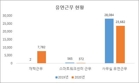 다만, 재택근무가 증가함에 따라 스마트워크센터 근무는 2019년 565명에서 2020년 372명으로 34.2% 감소했으며 사무실 유연근무는 2019년 28,084명에서 2020년 23,682명으로 15.7% 감소한 것으로 나타났다.