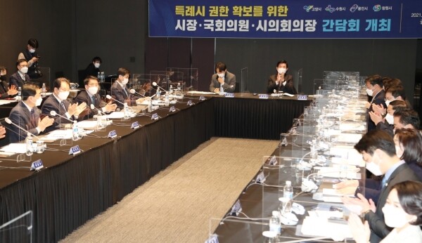 17일 백군기 용인시장, 이재준 고양시장, 염태영 수원시장, 허성무 창원시장과 정찬민·김민기·이탄희의원 등 해당 지역구 국회의원, 김기준 의장 등 시의회 의장들은 서울 여의도 글래드 호텔에서 ‘특례시 권한 확보를 위한 간담회’를 가졌다.