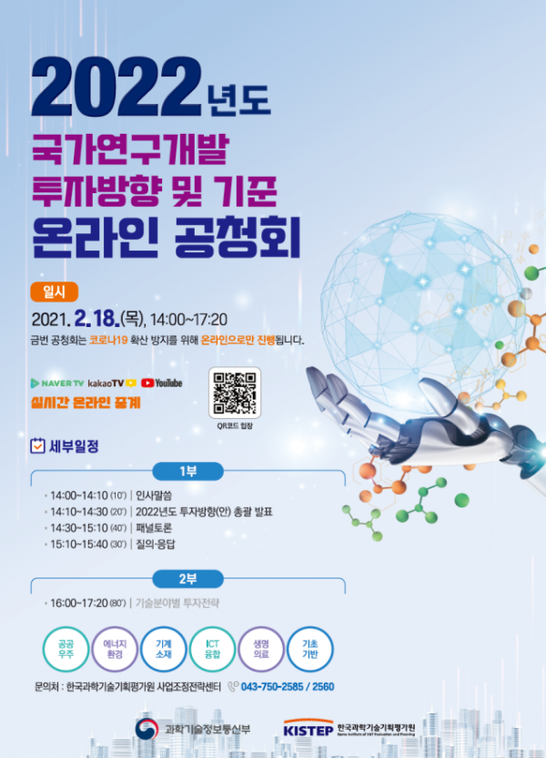 이번 투자방향 공청회는 정부연구개발 예산이 국민이 꼭 필요로 하는 곳에 전략적·효율적으로 투자가 이루어질 수 있도록, ’22년도 투자방향에 대해 연구현장과 국민들의 생생한 의견을 듣기 위해 마련한 자리로 코로나19 확산 방지 차원에서 전면 온라인 방식으로 개최된다.