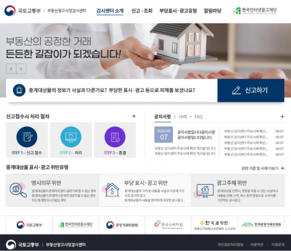 국토교통부 부동산산업과 한정희 과장은 “지난 8월 허위매물 등에 대한 광고를 금지하는 공인중개사법이 시행된 이후 지속적인 교육·홍보를 통해 제도가 현장에서 실행력을 갖도록 노력하고 있다”며 “올해는 모니터링 대상을 상대적으로 관리가 취약할 수 있는 소셜네트워크서비스로도 확대해 나가는 등 건전하고 투명한 온라인 부동산 시장의 조성에 더욱 박차를 가하고 있는 만큼, 위반 의심 표시·광고에 대한 적극적인 신고와 함께 업계의 지속적인 자율시정 노력”도 당부했다.