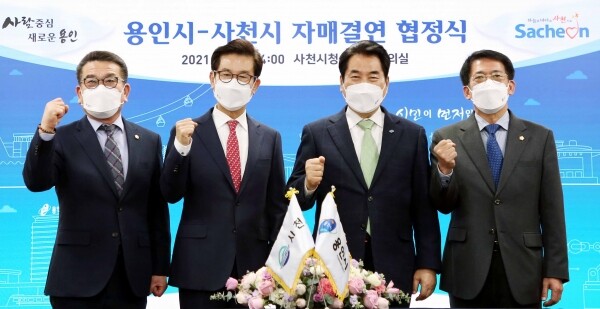 이날 사천시청에서 열린 ‘용인시-사천시 자매결연 협정식’에는 백군기 용인시장을 비롯해 김기준 용인시의회 의장, 송도근 사천시장, 이삼수 사천시의회 의장 등이 참석했다.