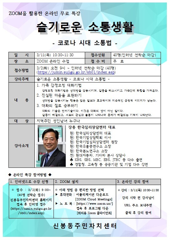 주민자치위원회 주관으로 열리는 이번 특강은 3월 11일 10시 30분부터 화상회의 플랫폼 줌을 활용해 온라인으로 진행되며 한국심리상담센터 강용 대표가 코로나 시대의 소통법과 관련된 다양한 내용을 전한다.