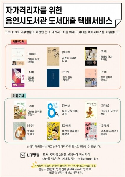 도서 대출은 자가격리자가 이메일 및 유선을 통해 도서를 신청하면 택배로 보내주는 방식으로 진행되고 반납은 발송일을 포함해 4주 이내에 가까운 공공도서관에서 하면 된다.