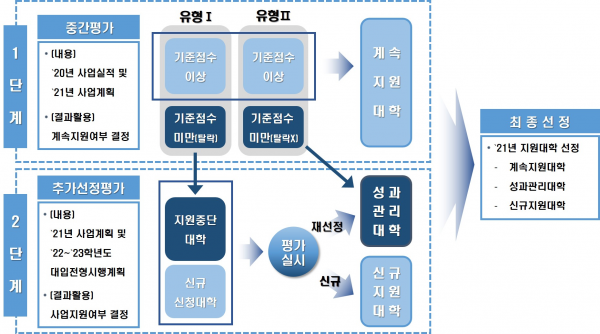 중간평가 및 추가선정평가를 통해 최종 선정된 지원 대학 중에서 중간평가 결과가 미흡한 대학을 ‘성과관리대학’으로 지정하고 집중 상담 등을 제공하며 관리할 예정이다.