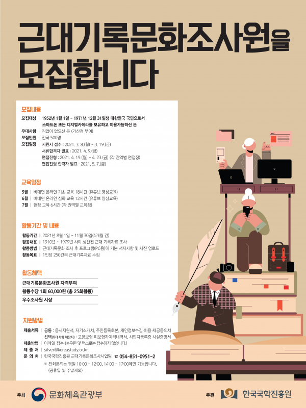 1910년부터 1979년 사이에 생산된 문서·서적·사진·도면 등의 기록자료 이번 공모에서는 전국 5개 권역에 걸쳐 근대기록문화 조사원 총 500명을 선발한다.