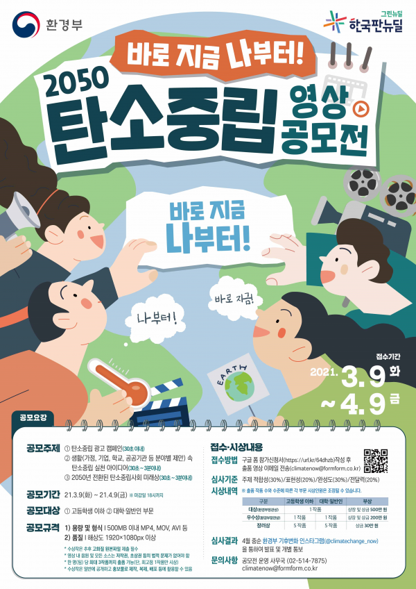 이번 공모전은 ‘탄소중립 광고’, ‘생활 속 탄소중립 실천법’, ‘국민이 상상하는 2050년 전환된 탄소중립 사회’ 등 3가지 주제로 열린다.