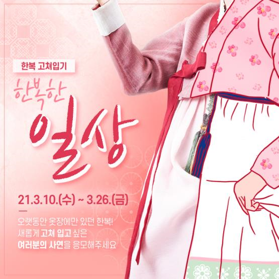 문화체육관광부는 한국공예·디자인문화진흥원 한복진흥센터와 함께 3월 10일부터 26일까지 국민들과 함께 한복에 얽힌 사연과 추억을 함께 나누는 ‘한복한 일상 - 한복 고쳐 입기’ 행사를 펼친다.