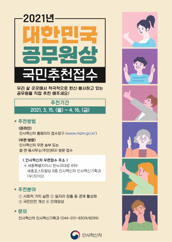 인사혁신처는 ‘제7회 대한민국 공무원상’ 후보자 국민추천 접수를 오는 15일부터 4월 16일까지 실시한다고 10일 밝혔다.