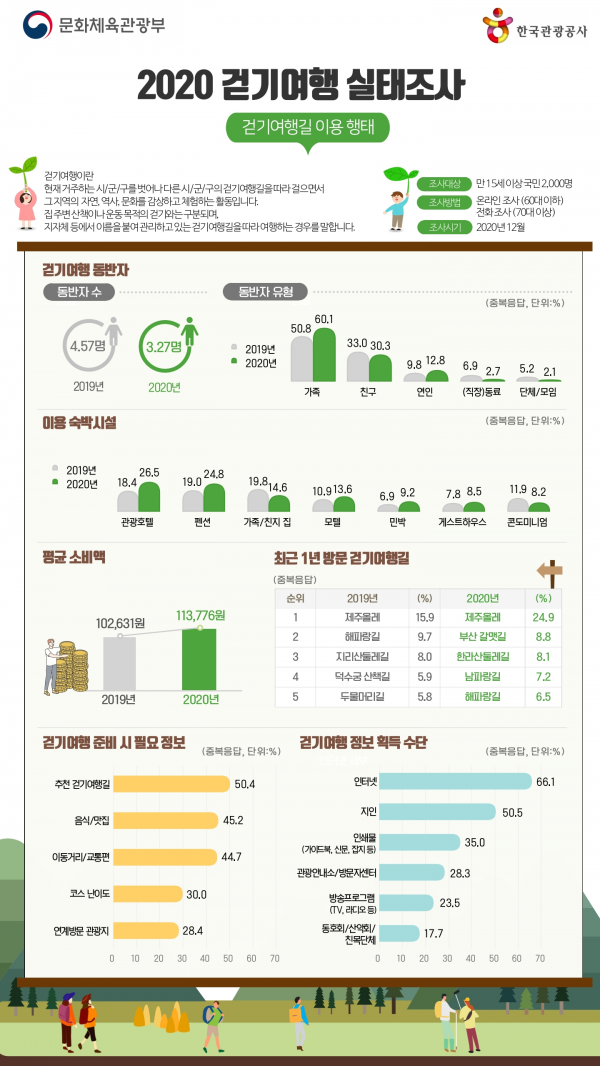 걷기여행 동반자 수는 2019년 4.57명에서 2020년 3.27명으로 감소했으며 동반자 유형은 가족단위 비율이 2019년 50.8%에서 2020년 60.1%로 크게 증가해 소규모, 가족중심 여행 특성을 보였다.