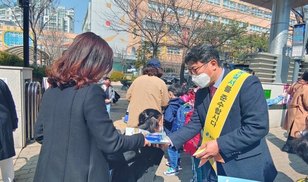 이날 김정원 수지구청장과 구청 직원 7명은 어린이 하교시간에 운전자들과 학부모를 대상으로 어린이 안전사고 예방을 위한 불법 주·정차 금지를 당부했다.