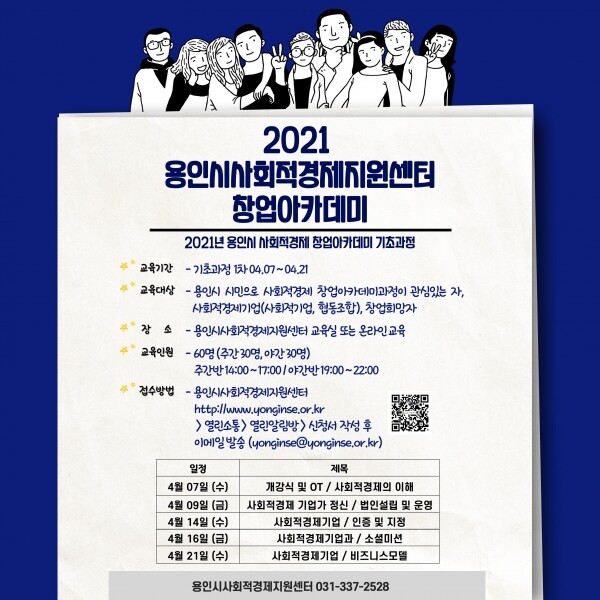 교육은 4월7일부터 4월21일까지 매주 2회 용인시사회적경제지원센터 교육실이나 온라인으로 진행되며 다양한 수강생이 참여할 수 있도록 주간반 30명, 야간반 30명으로 나눠 운영한다.