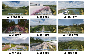 용산공원 조성계획을 토대로 제작 된 VR 용산공원은 벚꽃가로 호수, 산마루길 및 초원 등, 공원의 주요지점 10개소에서 공원 한복판에 서 있는 듯한 360도 가상현실을 구현하고 공원을 한눈에 조망할 수 있는 항공뷰 2개소를 제공한다.
