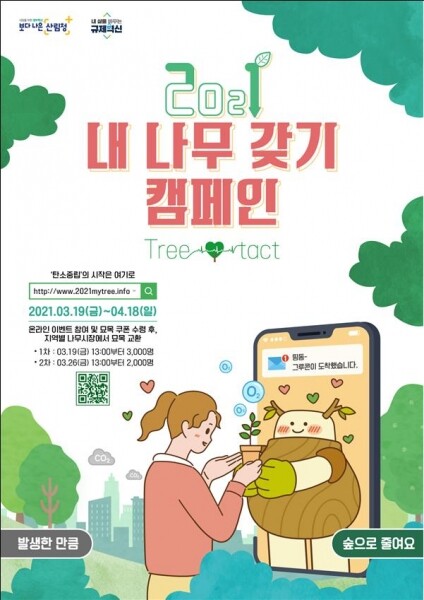 금년 ‘2021 내나무 갖기 캠페인’은 2회에 걸쳐 묘목 교환권인 ‘그루콘’을 총 5,000매 선착순 배부할 예정이며 많은 국민에게 참여 기회를 골고루 주기 위해 1인 1회 참여만 가능하다.