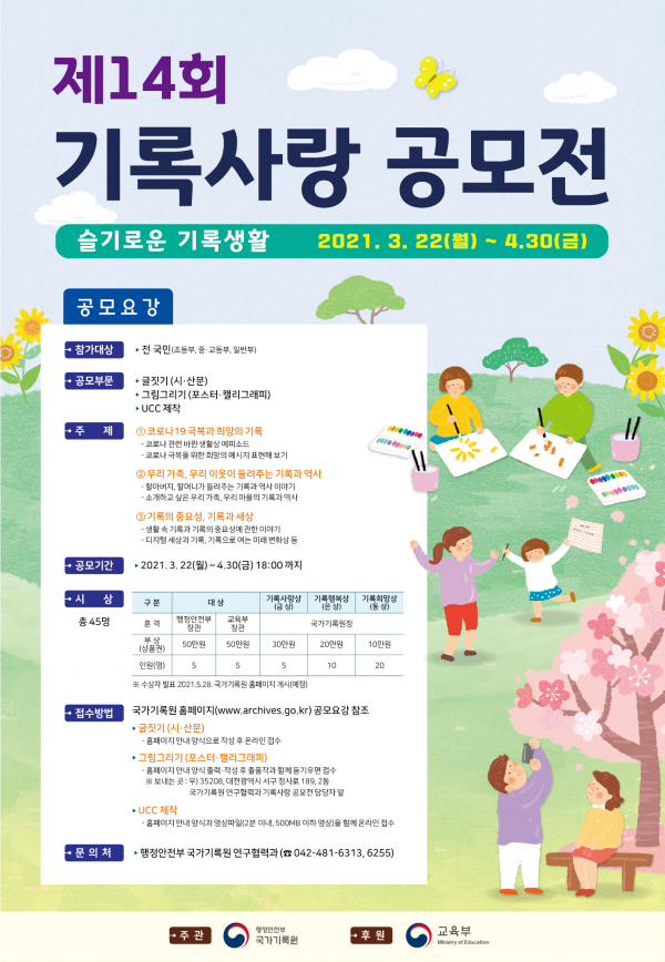국가기록원이 주최하고 교육부가 후원하는 이번 공모전은 초등학생 이상 전 국민을 대상으로 3월 22일부터 4월 30일까지 40일간 진행한다.
