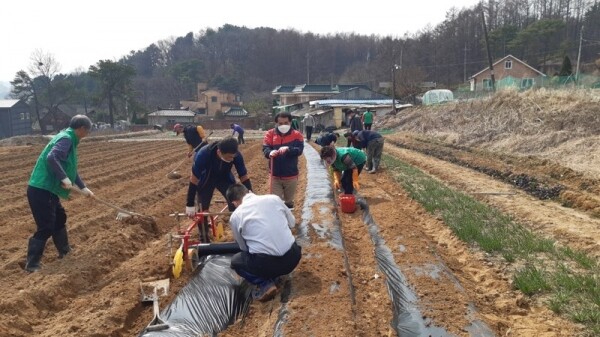 이날 새마을회 회원 50여명이 밭을 갈고 80kg 감자씨를 파종했다.