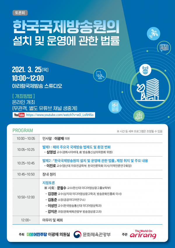 이번 토론회에서는 국회에서의 본격적인 논의에 앞서 관련 전문가들과 법안의 주요 내용을 공유하고 국제방송의 역할과 경쟁력 강화를 위한 법·제도적 지원 방안에 대한 의견을 수렴한다.