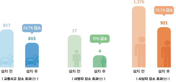 회전교차로 설치 전·후 교통사고 현황을 분석한 결과, 교통사고 건수는 817건에서 615건으로 24.7%가 감소했고 사상자수는 1,376명에서 921명으로 33.1% 감소했다.