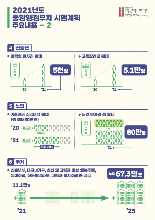 작년 말 위원회는 “모든 세대의 삶의 질 보장”, 저출산·고령사회에 대한 “대응과 적응의 병행”이라는 패러다임 전환 하에 제4차 저출산·고령사회 기본계획을 수립한 바 있으며 이번 2021년도 시행계획은 제4차 기본계획의 주된 정책방향을 반영해 향후 5년간의 구체적 청사진을 제시한 최초 시행계획이란 점에서 의미가 깊다.