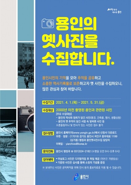 시 관계자는 “용인의 옛 모습을 담고 있는 사진을 수집해 시민들의 삶과 문화를 이해함은 물론 가치 있는 기록으로 보존하고자 한다”며 “시민 여러분의 많은 관심과 참여를 바란다”고 말했다.