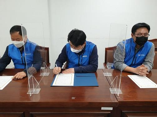 먼저, 지난 3월 22일 공공부문의 1회용품 사용을 줄이고 탄소중립 실현에 기여하기 위해 박진천 환경부노조 위원장을 비롯한 노조임원들은 청사 내에서 1회용품을 반입하거나 사용하지 않는다는 실천 사항을 선언했다.