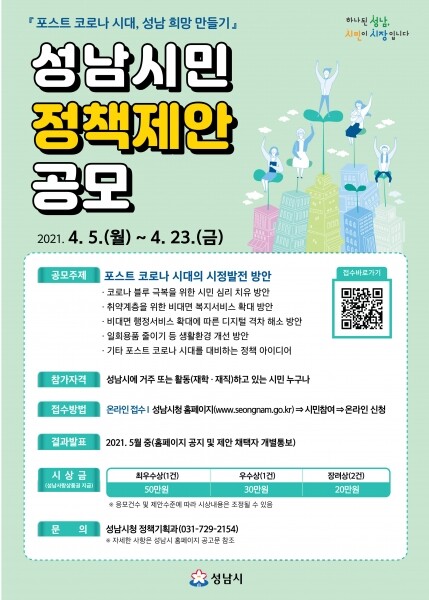 성남시 정책기획과 관계자는 “시민 여러분의 제안이 정책이 된다”며 “포스트 코로나 시대를 슬기롭게 대처할 수 있는 시민 맞춤형 사업을 발굴할 수 있도록 많은 관심과 참여를 당부한다”고 말했다.