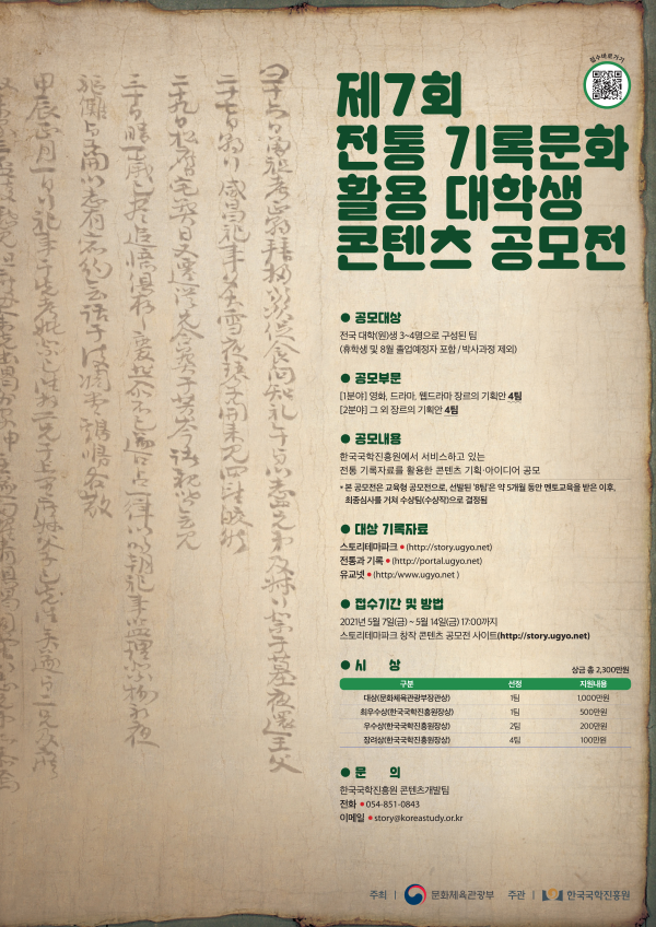 문화체육관광부는 과거와 현재를 이어주는 전통 기록문화의 무한한 가능성에 착안해 한국국학진흥원과 함께 5월 7일부터 14일까지 ‘제7회 전통 기록문화 활용 대학생 콘텐츠 공모전’을 개최한다.