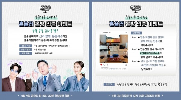 ‘신과 함께’는 첫 방송을 앞두고 공식 인스타그램을 통해 전국의 방구석 ‘혼술러’와 ‘애주가’를 위한 본방 인증 이벤트도 진행한다.