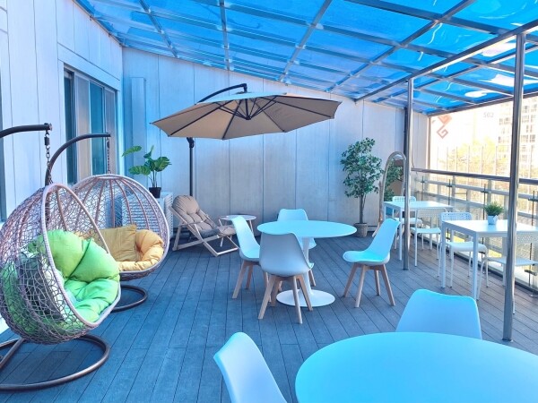 바닥을 목재 덱으로 시공하고 소파와 빈백, 테라스 의자 등을 배치해 카페와 같은 분위기를 연출해 학생들이 편하게 쉴 수 있는 공간을 마련했다.