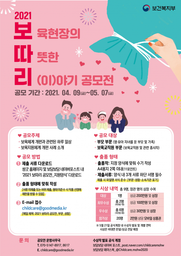 공모전 주제는 보육지원체계 개편에 관련된 보육교직원·학부모·우리가족 이야기, 보육지원체계 개편으로 바뀐 구체적 하루 일상으로 부모 부문과 보육교직원 부문으로 나누어 진행하며 수기 형식을 통해 제안받는다.