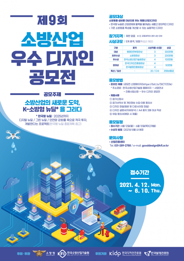 주제는‘소방산업의 새로운 도약, K-소방형 뉴딜을 그리다’로 소방용품, 설비를 대상으로 창의적이고 실용적인 디자인을 공모한다.