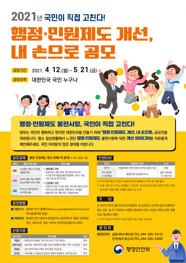 한창섭 행정안전부 정부혁신조직실장은 “이번 공모전은 정책수요자인 국민이 직접 행정 및 민원제도 개선에 참여한다는 데에 의의가 있다”며 “공모전을 통해 피부에 와닿는 실질적인 제도개선이 이루어질 수 있도록 국민들의 적극적인 참여와 관심을 부탁드린다”고 말했다.