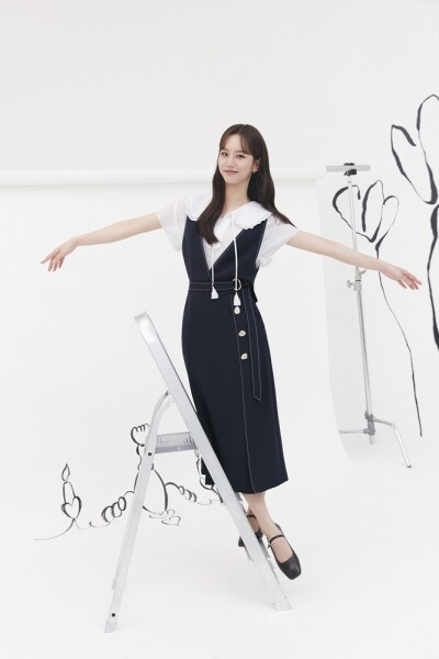 이번 캠페인에서 혜리는 플라워 레이스 소재의 쉬폰 원피스, 슬리브리스 블라우스와 팬츠 셋업에 그린 체크 컬러의 숏 자켓, 그리고 뷔스티에 원피스에 와이드한 칼라 디자인의 블라우스를 매치해 한껏 사랑스러운 룩을 제안한다.