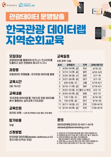 4월 29일 경남을 시작으로 오는 8월 20일까지 8개 권역에서 총 12회에 걸쳐 실시되며 관광빅데이터 활용에 관심 있는 관광부문 종사자는 누구나 무료로 참여 가능하다.