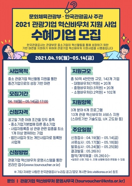 공사 이영근 관광기업육성팀장은 “이번 공모는 코로나 장기화로 어려움을 겪는 관광기업의 상황을 고려, 전년대비 지원규모와 대상을 확대했다”며 “선정 이후에도 개별 바우처 프로젝트의 성과 극대화를 위해 기업 간 네트워킹, 전문가 멘토링 등의 지원프로그램을 강화할 예정”이라고 밝혔다.