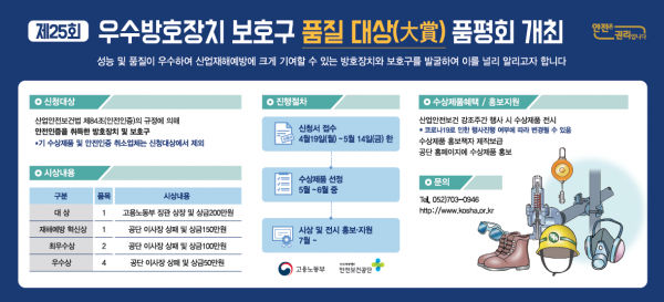 우수제품에는 상금과 상패를 비롯해 공단 본부의 홍보전시관에 수상 제품을 상설 전시하거나 7월 개최 예정인 국제안전보건전시회에서 홍보할 기회를 제공할 계획이라고 전했다.